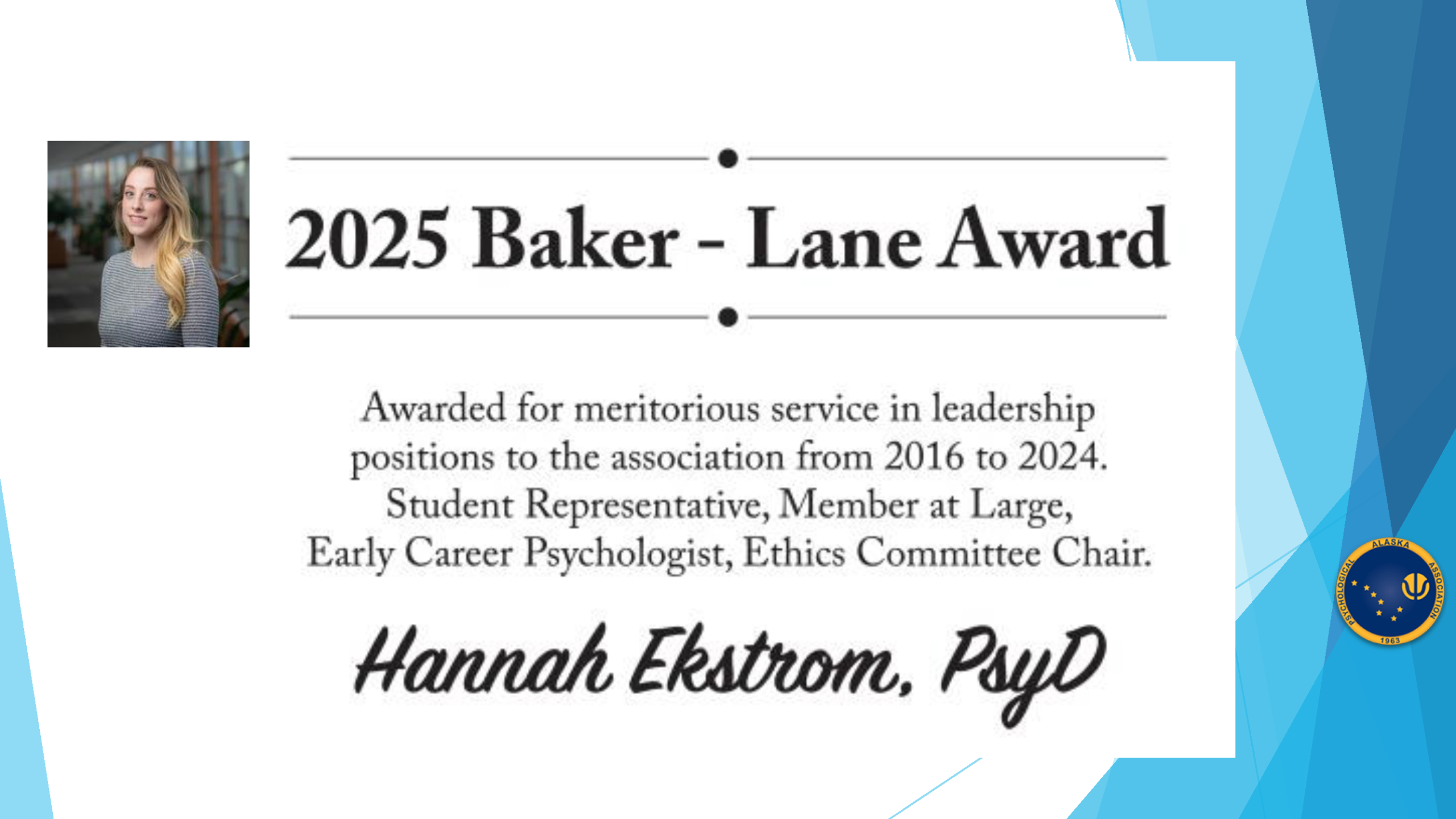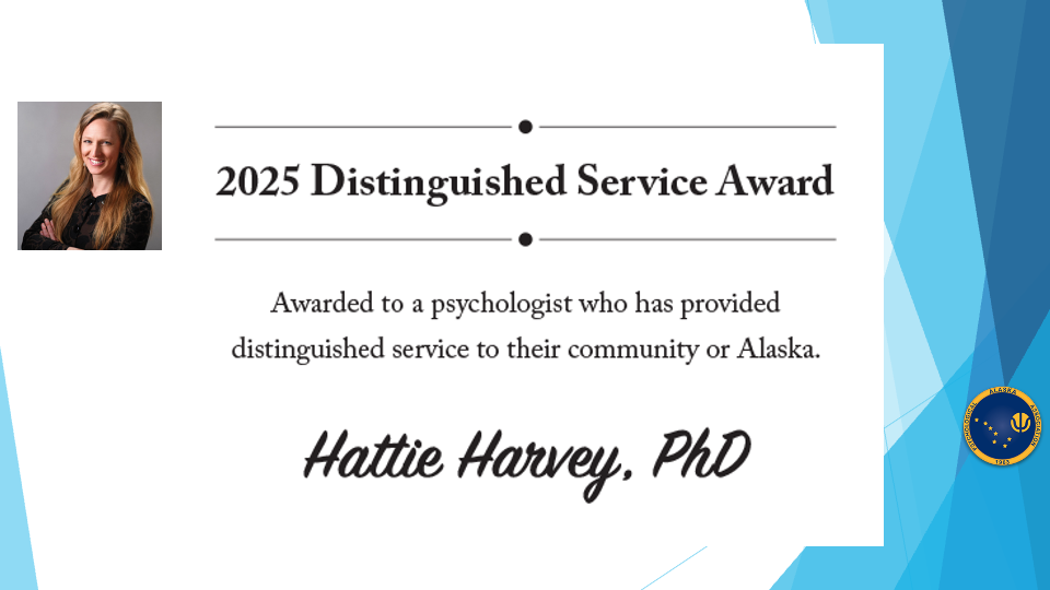 Awarded to a Psychologist, mental health provider or educator who has provided distinguished service for their community or in Alaska.