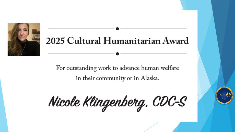 Nicole is nominated for the Cultural Humanitarian Award in recognition of her commitment to advancing human welfare in our community. In her role as a Certified Chemical Dependency Counselor (CDC) and CDC Supervisor (CDC-S), Nicole has shown compassion, professionalism, and a deep dedication to serving underserved populations, particularly Alaska Native people.